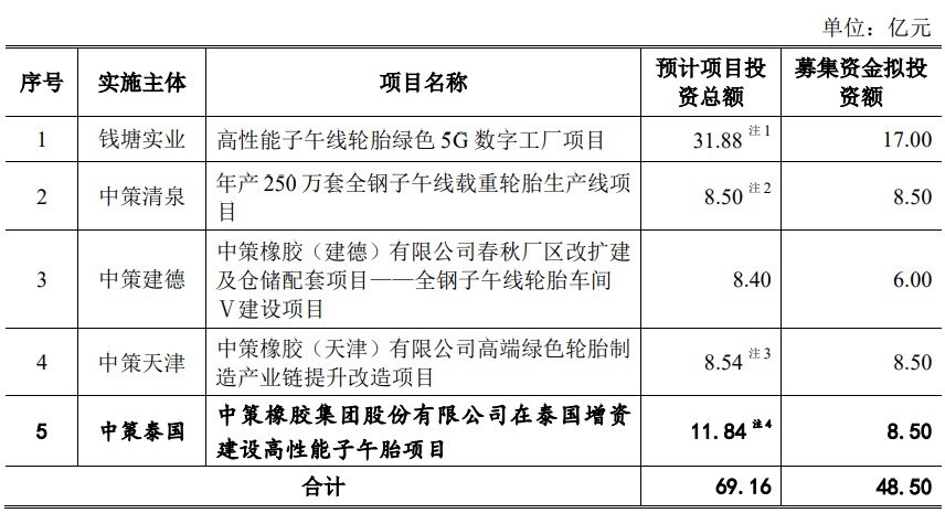 中策橡胶本次拟在上交所主板募集资金48.50亿元,用于高性能子午线轮胎绿色5G数字工厂项目、年产250万套全钢子午线载重轮胎生产线项目、中策橡胶(建德)有限公司春秋厂区改扩建及仓储配套项目——全钢子午线轮胎车间Ⅴ建设项目、中策橡胶(天津)有限公司高端绿色轮胎制造产业链提升改造项目、中策橡胶集团股份有限公司在泰国增资建设高性能子午胎项目。